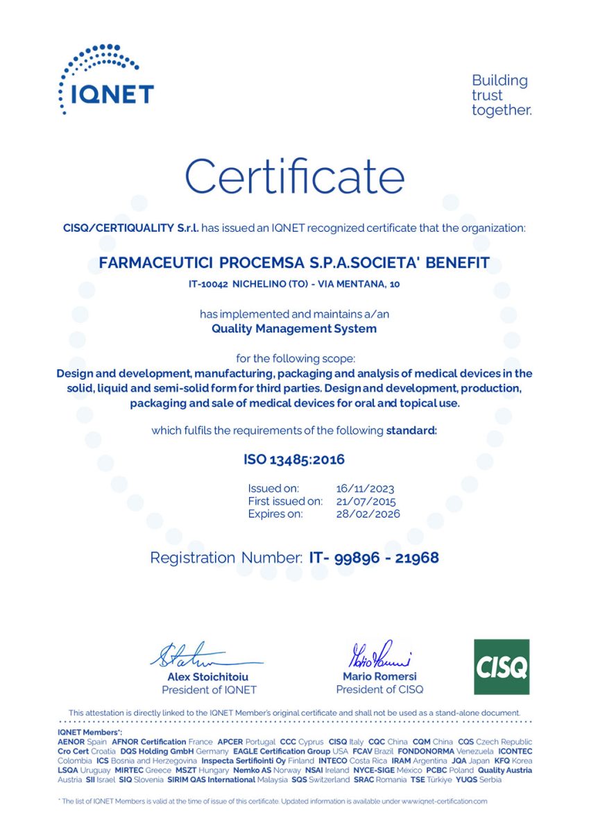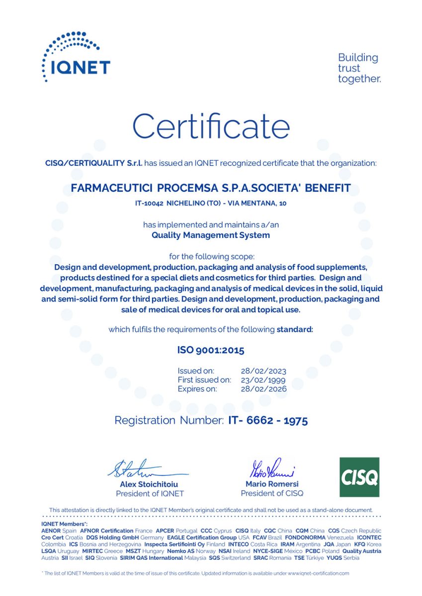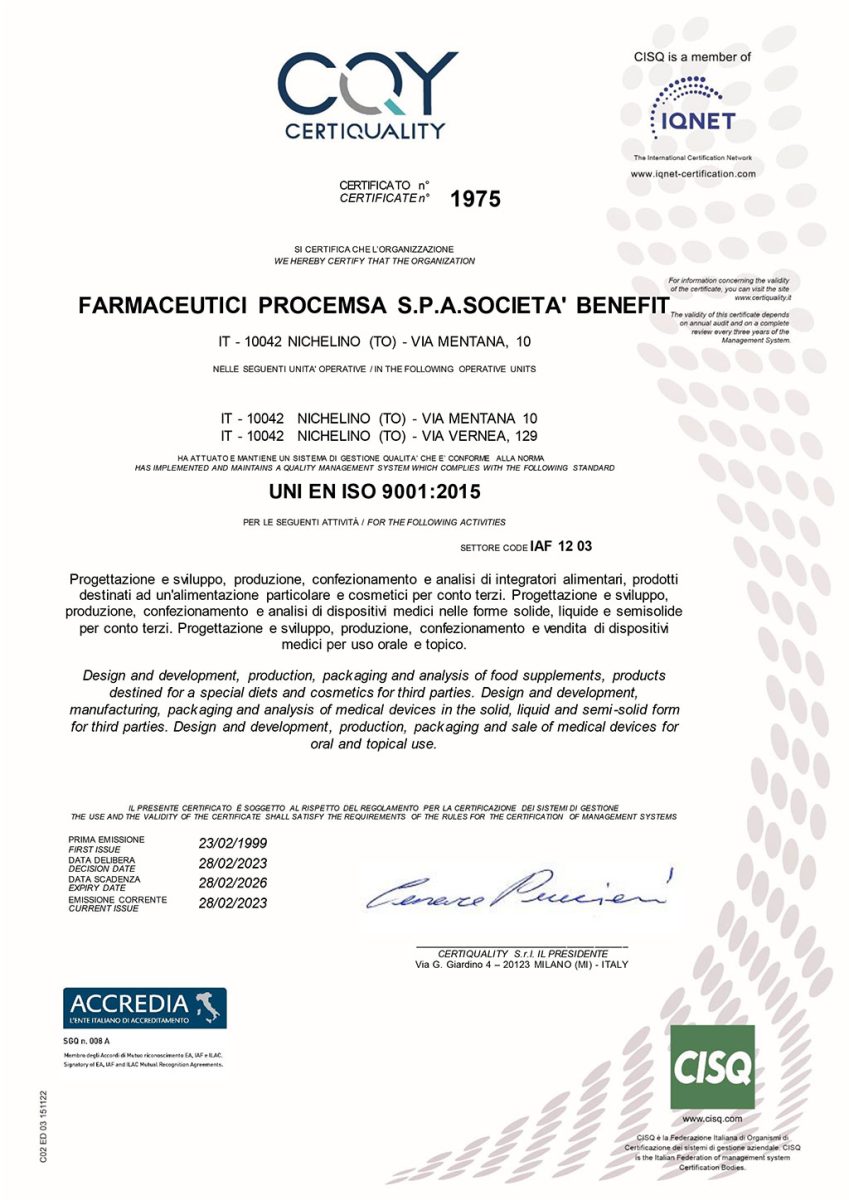 Procemsa dispone di un sistema di qualità integrato che garantisce tutte le fasi di sviluppo, produzione e confezionamento dei suoi prodotti.