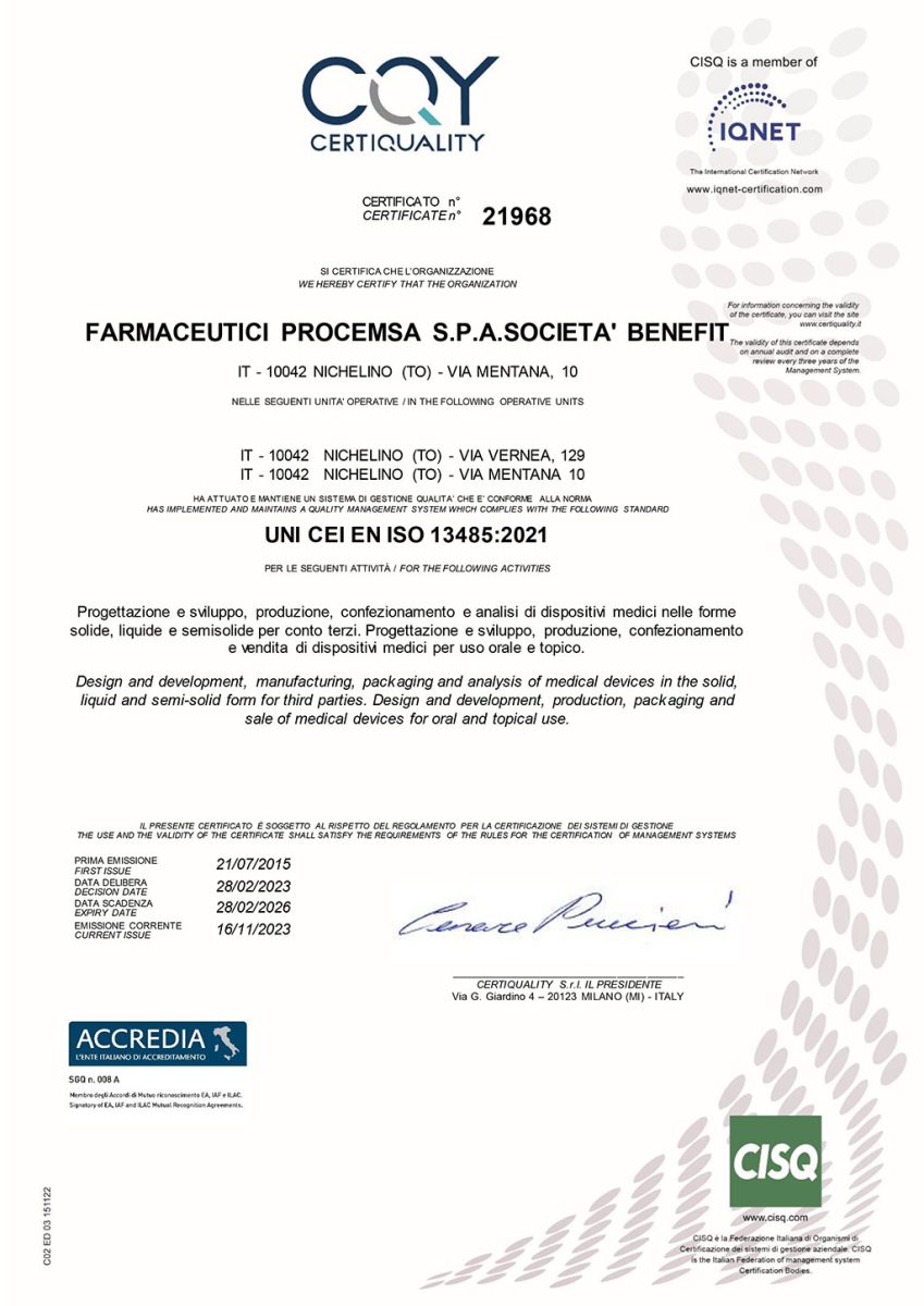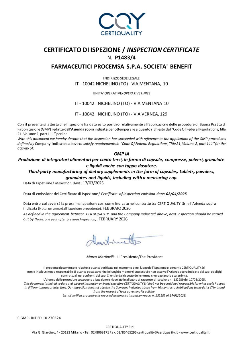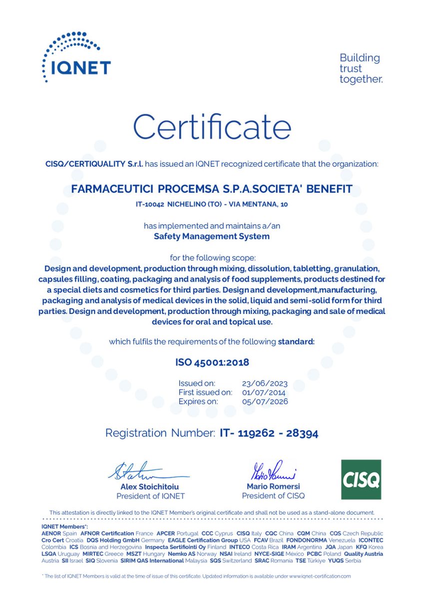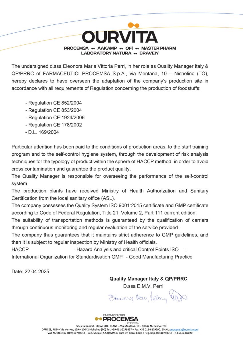 Procemsa dispone di un sistema di qualità integrato che garantisce tutte le fasi di sviluppo, produzione e confezionamento dei suoi prodotti.