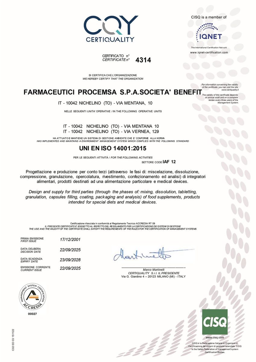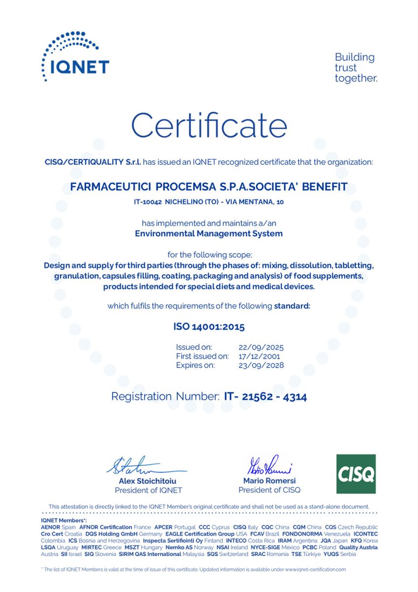 Procemsa è certificata ISO 14001 sulla protezione ambientale.